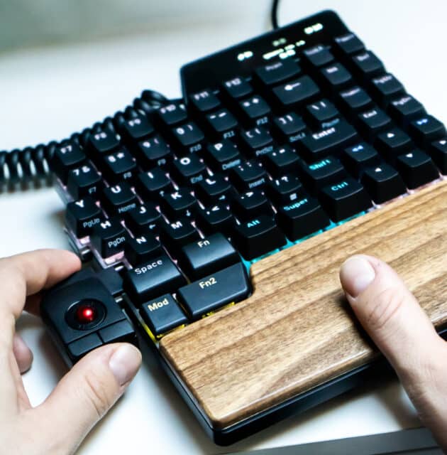 The rubber palm rest matches the wooden one in size and shape. Its durability is on par, too, thanks to the rubber being fixed to a powder-coated steel plate that connects to the UHK.