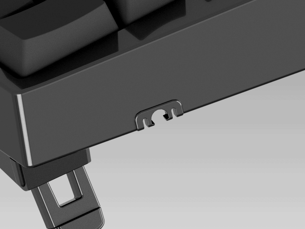 UHK 60 v1 feet were fixed by screws, and the legs had to be inserted into feet bases after screwing. This solution was reliable and worked well, but the feet’ installation and removal were quite time-consuming and demanding. This mechanism also discouraged experimentation with different setups, such as tenting versus negative-tilting.