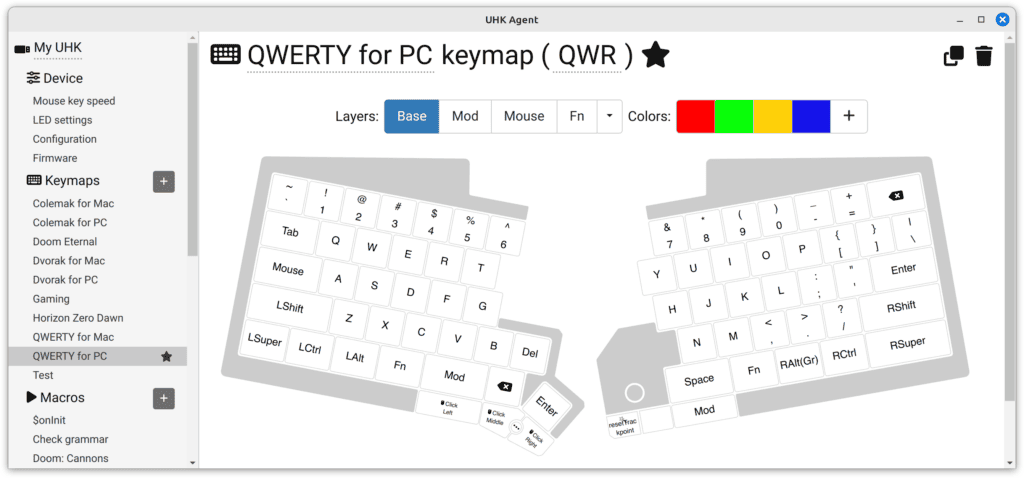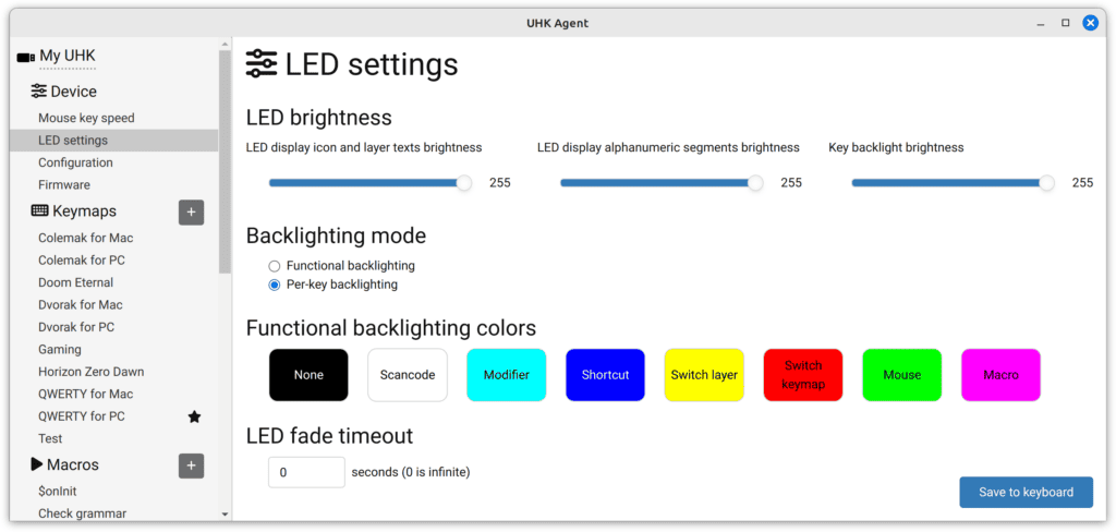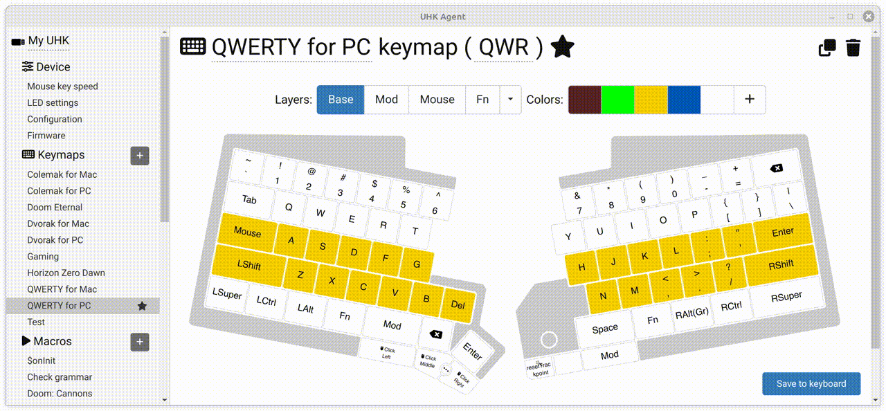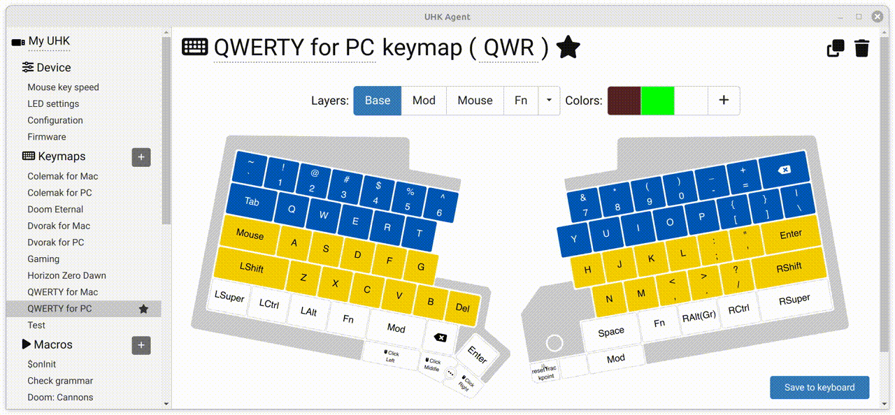When hitting the "Save to keyboard" button, the colors will be updated on your UHK. Key colors are saved per keymap and per layer.