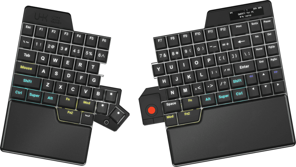 "I thought the UHK60v2 was perfect, but the UHK80 really surprised me. I'm wheelchair bound, so I have to constantly shift my sitting position. With all the new connection options, extra keys, and the ability to pair the halves wirelessly, I can sit as wonky as I want and the UHK80 can move with me." - Phil (pcooke9)