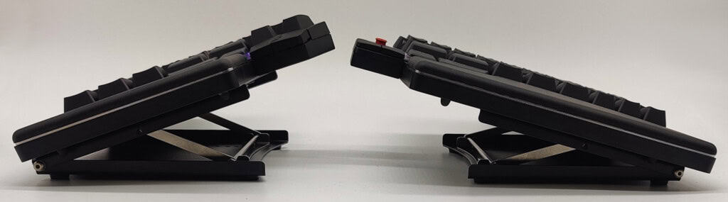 Given that the right keyboard half is wider than the left, it makes sense to set a lower angle for the right Riser half than the left half so the height of the keycaps is more even. I recommend 20 degrees for the left half and 15 degrees for the right half.