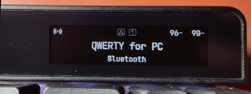 Given the UHK 80's many features, there’s plenty of useful information to display. In the top bar, from left to right, you can see the connection status of the keyboard halves, the state of Caps Lock and Num Lock, and the batteries' charge level. The keymap name is featured in the middle of the display, followed by the name of the current host connection at the bottom.
