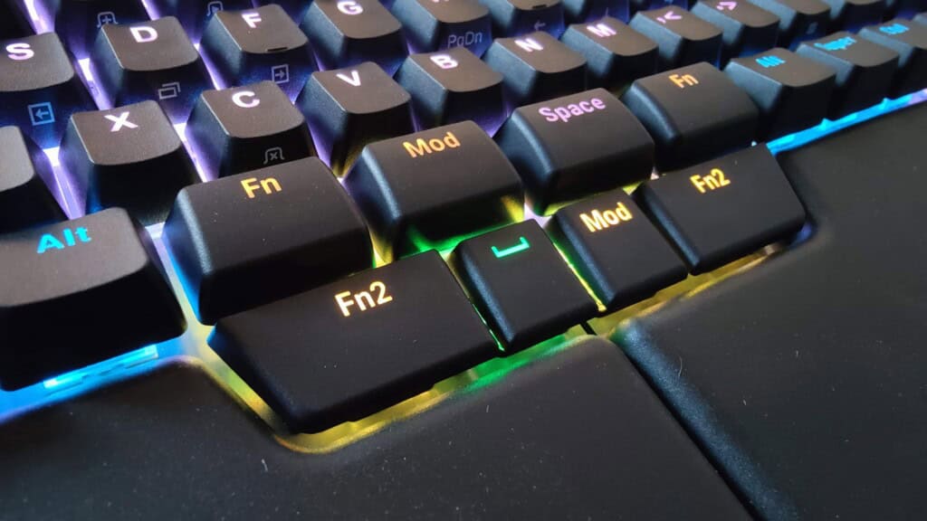 We went from a 60% layout to an 80% tenkeyless layout, so Escape, F1 to F12, and a navigation cluster were added. Thanks to the new floating key design, the outer edges of the UHK 60 are not present, making the UHK 80 more space-efficient, so it’s only 25 mm or 1 inch wider than the UHK 60. The double-left and double-right keys above the left and right keys jump left and right by word by default. Consequently, the right Shift and Control became smaller by 1U, which is still comfortable to reach.