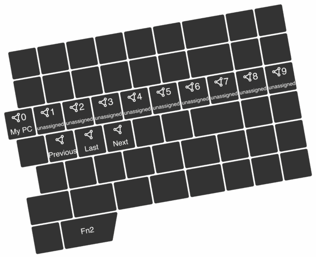 Use the following default mappings of the Fn2 layer for connection switching. The top row mappings enable absolute connection switching, while the bottom row allows for relative connection switching.