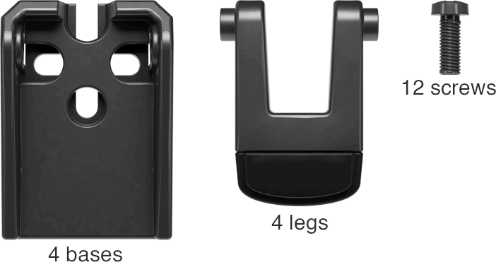 Use a Philips PH1 screwdriver to screw on the 4 bases using the 12 screws. See the orientation of the bases and the location of the screws: