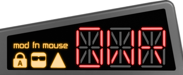 On the LED segment display, the three-letter abbreviation of the current keymap is displayed on the right. The mod, fn, or mouse indicator is enabled according to the current layer. The lock icon displays the status of Caps Lock. The rectangle with sunglasses icon shows whether Agent is connected to the UHK. The triangle icon shows whether adaptive mode is enabled, which will automatically change the keymap based on the foreground application as soon as it gets implemented.