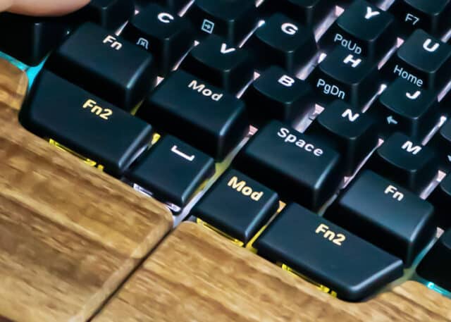 The UHK 80 utilizes a 80% tenkeyless layout, so Escape, F1 to F12, and a navigation cluster are present. The double-left and double-right keys above the left and right keys jump left and right by word by default.